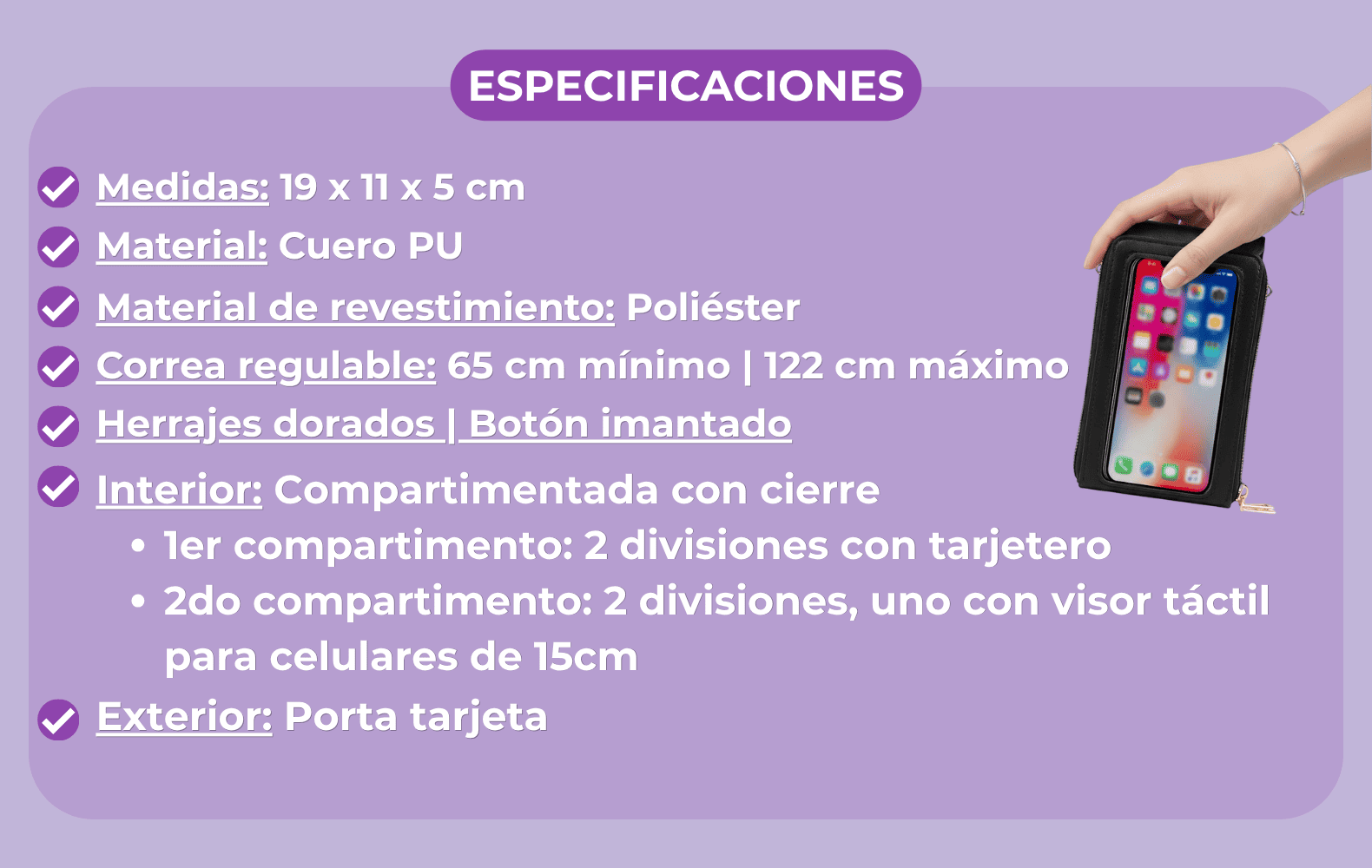 ¿Te pasa que justo cuando más lo necesitás, tu celular está perdido en el fondo de la cartera? Con nuestra bandolera SMART TOUCH PREMIUM con visor podésusar el teléfono sin sacarlo de la cartera. Atendé llamadas, chequeá mensajes o navegá en redes sociales.